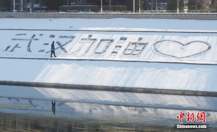 2月8日,中国农历元宵节,民众在北京通惠河畔的积雪上留下文字,声援武汉,祝福元宵佳节。中新社记者 毛建军 摄