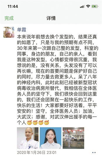 武汉大学人民医院单霞的朋友圈。为了避免交叉感染,节约穿防护服的时间,她剃了个光头。