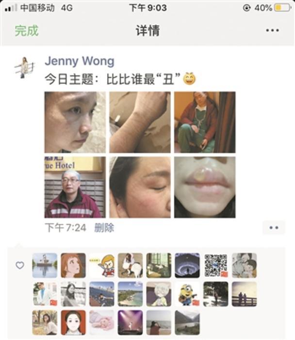 江苏省第二批支援湖北医疗队队员王珍妮下班后在微信群里征集的“丑”照。有的医护人员嘴角起泡、有的脸上被防护面具勒出印痕。