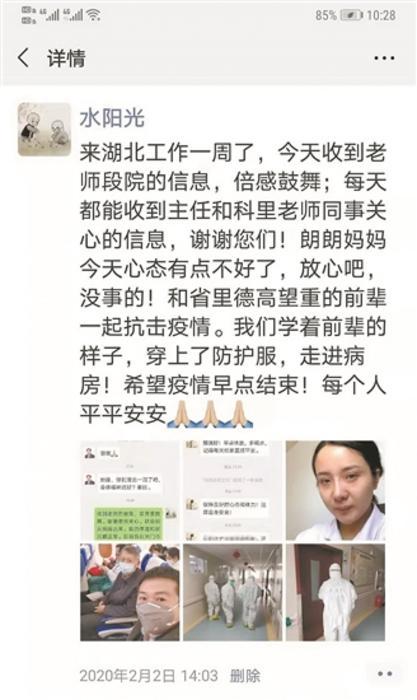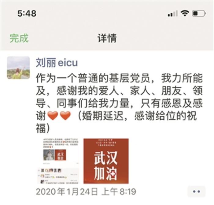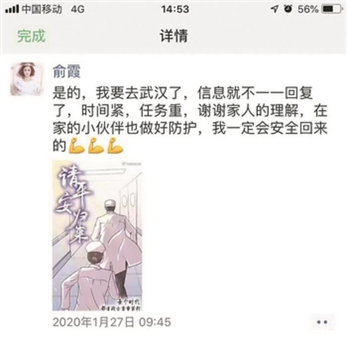 俞霞是呼吸与危重症医学科ICU主管护士。支援武汉前,她在朋友圈回应亲朋好友的关心和询问。