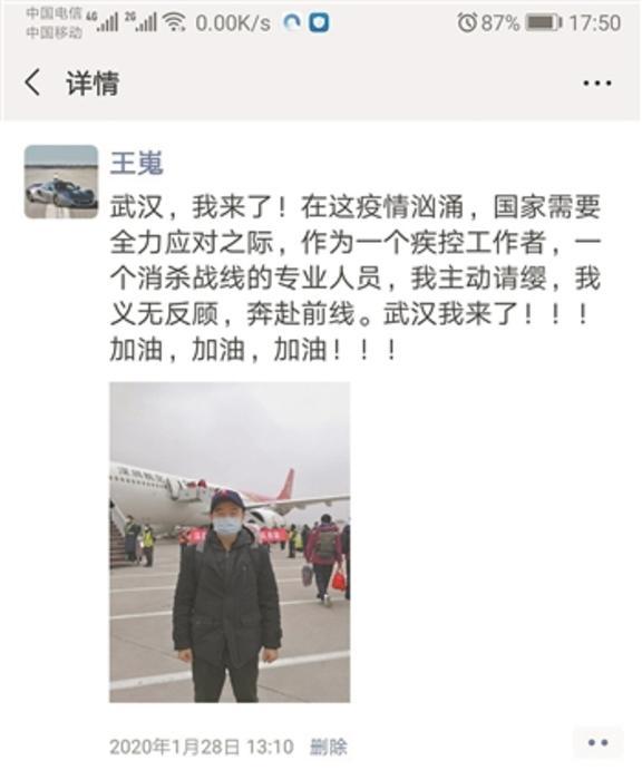 1月28日,王嵬作为支援湖北医疗队的内消杀专家抵达武汉。