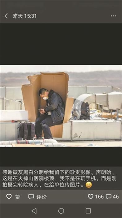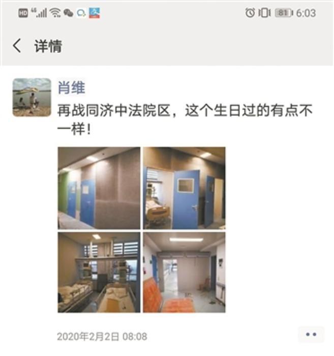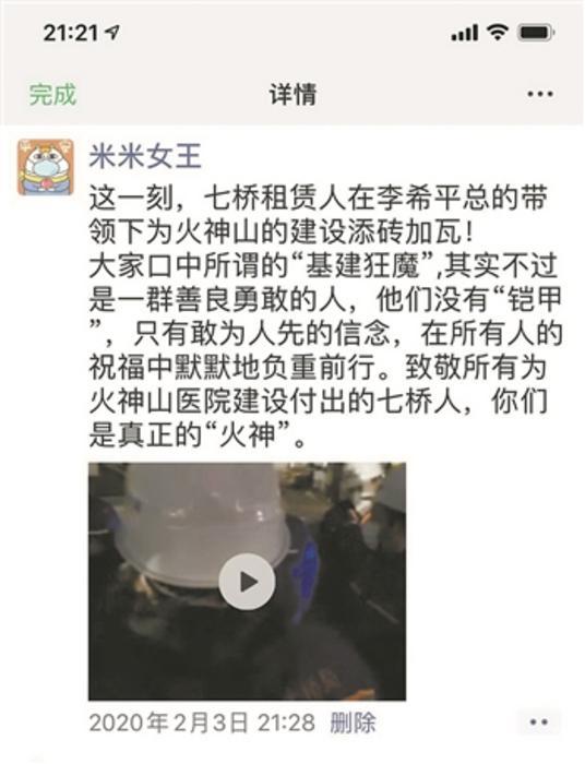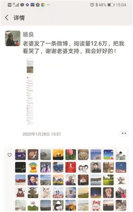 雷神山医院项目党支部书记骆良的朋友圈。已经怀孕9个月的妻子郑乐用手机拍下他离去的背影,在微博里获得12.6万的阅读量。