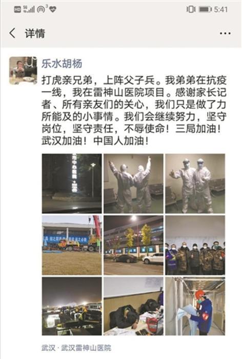 中建三局一公司朱建周的朋友圈。他的弟弟朱建宁是一名外科医生,兄弟俩同时在抗疫一线。