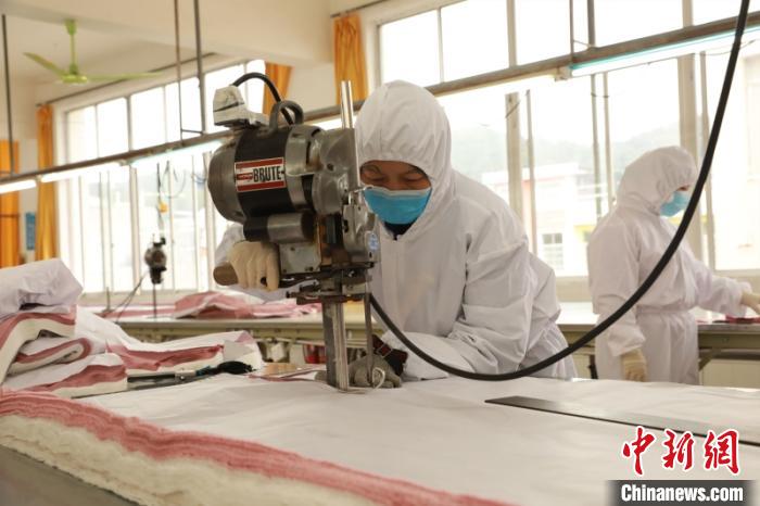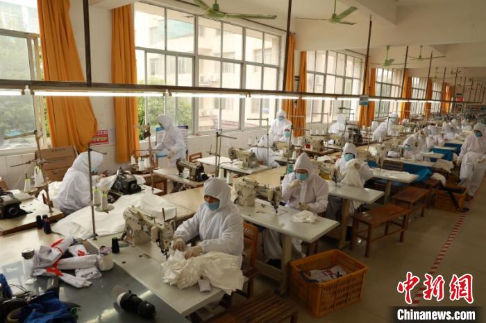 图为工人在生产防护服 钟欣 摄