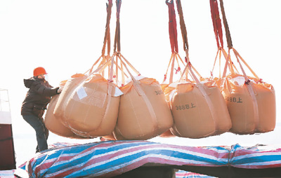 日前,工人在江苏南通港港口装运出口化肥。许丛军摄(人民图片)