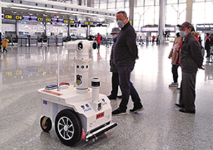 “请大家戴好口罩,注意个人卫生,不要前往人流密集场所……”连日来,在广州、上海、贵阳等地人员较为密集的公共场所,都能看到一个长着“大眼睛”的机器人不知疲倦地来回喊话,这是诞生于广州市黄埔区的国内首款用于测体温的巡逻机器人——“千巡警用巡逻机器人”。这款机器人能够对5米范围内10人同时红外测温、误差不超过0.5摄氏度,有效减少了警务人员因为人员接触交叉感染的风险。