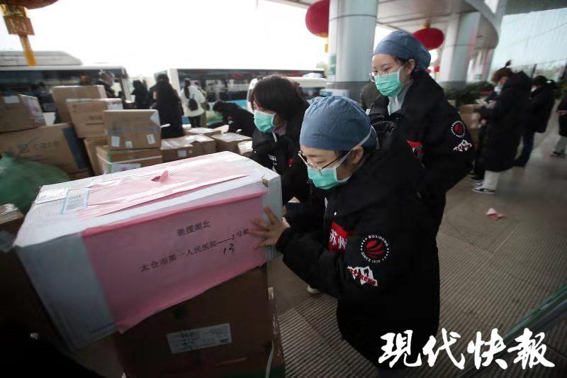 " 同一天那么多航班抵达,行李和物资迟了一点,但不存在被扣留的事。" 江苏援湖北医疗队总领队邱泽森介绍,2 月 9 日,江苏 958 名医护人员乘坐 7 架飞机,陆续在下午、晚上抵达武汉。当天机场人太多,全国各地来的每支医疗队都携带了大量物资,协调运输这些物资的工作量巨大,出现了一些延误的情况。当时采取的办法是先把人接走,再运送行李。部分行李和物资送到酒店后,队员们连夜整理。" 现在都送过来了,已经清点完毕。"