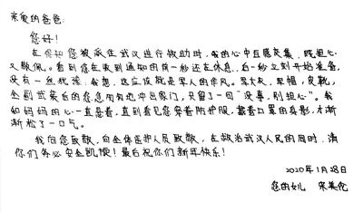 他们的女儿宋美伦,在父母执行任务这段时间,她每天都从网络上查看武昌医院的救治动态,盼望着能找到爸爸的身影。她还跟妈妈要了一张爸爸穿防护服的照片,自豪地分享给同学们,把爸爸称作英雄。大年初四,妈妈在电话里告诉她,爸爸很忙,但一切都好。她想打电话不便,就提笔给爸爸手写了一封信,拍了照,用微信发过去。宋美伦在信里写道:“我向您致敬,向全体医护人员致敬,在救治武汉人民的同时,请你们务必安全凯旋!”信虽不长,却在字里行间诉说着对爸爸的想念和敬佩,流淌着女儿的自豪和支持!