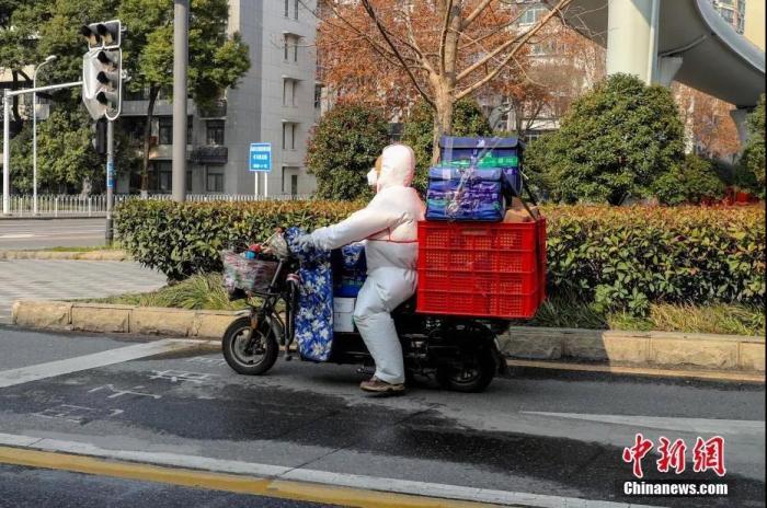湖北武汉武珞路,一位身穿防护服的配送员在工作中。中新社记者 张畅 摄