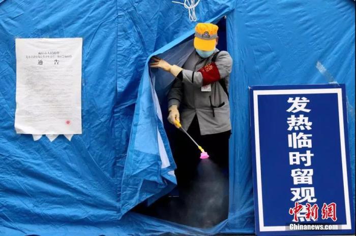 陕西咸阳秦都高铁站外,工作人员为发热临时留观点消毒。中新社记者 张远 摄
