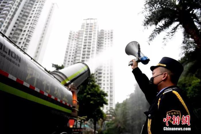 2月11日,大型雾炮车、喷雾机、洒水车同时出动,对广州番禺区祈福新邨公共区域进行全面消毒。中新社记者 姬东 摄