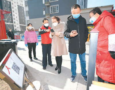 2月4日起,宁夏回族自治区银川市西夏区北京西路街道办辖区9个社区开始使用扫码登记出入。居民通过手机扫码填写住户信息、体温信息、出入理由等方可出入小区,既减少人员接触又保证人员快速进出不聚集。新华社记者 王 鹏摄