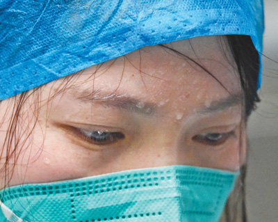 湖南省郴州市嘉禾县人民医院检验科护士曾梅连续工作6个小时后卸下护目镜。黄春涛摄(影像中国)