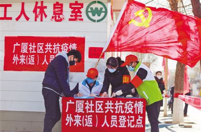 甘肃省酒泉市广厦社区党员干部在管控点对出入人员进行登记。侯崇慧摄(人民视觉)