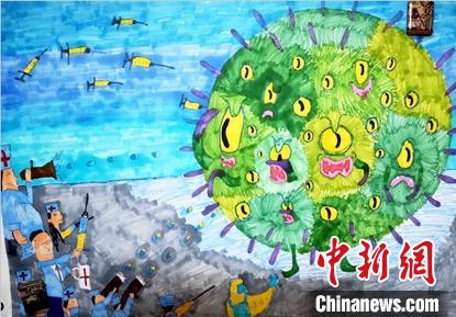 《作战》刘况青 7岁这是一场医护人员与新型冠状病毒间的作战!狡猾嚣张的病毒张牙舞爪向人类发起攻击,医护人员在大口罩的防护下,手持针管,团结一致抗击病毒。 中国宋庆龄青少年科技文化交流中心供图