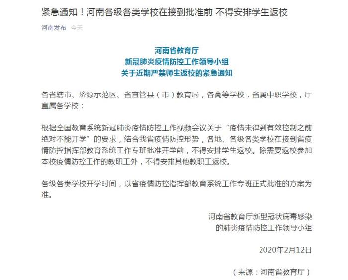 中新网2月12日电 据河南省人民政府办公厅官方微信消息,河南省教育厅新型冠状病毒感染的肺炎疫情防控工作领导小组日前印发《关于近期严禁师生返校的紧急通知》(以下简称《通知》)。《通知》指出,各地、各级各类学校在接到省疫情防控指挥部教育系统工作专班批准开学前,不得安排学生返校。
