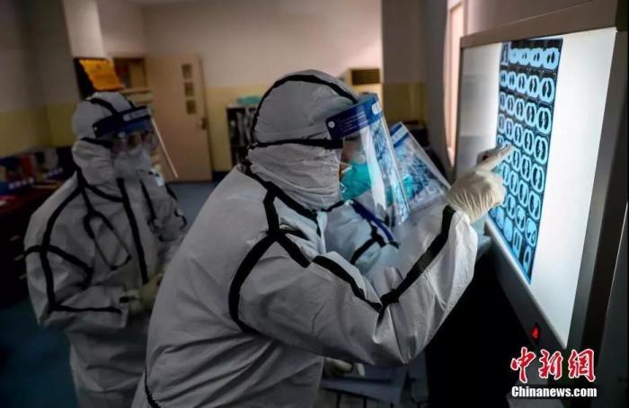 2月3日,在武汉的医务人员查看患者肺部CT片。中新社记者 张畅 摄