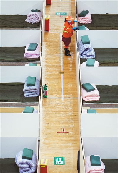 2月12日,工人在即将开放的方舱医院进行整理和清洁工作。新华社记者 肖艺九摄