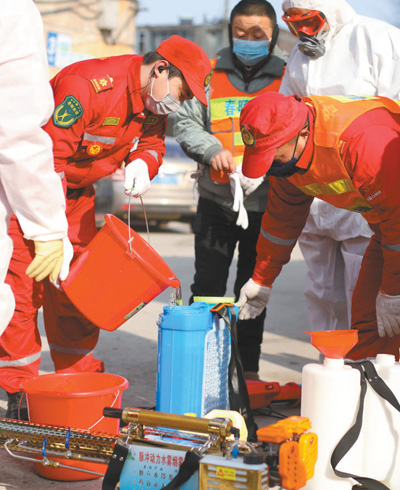 共青团河北衡水市委联合衡水市春晖义工协会等开展疫情防控志愿服务,图为志愿者在社区准备消毒作业。史自强 陈 康摄影报道