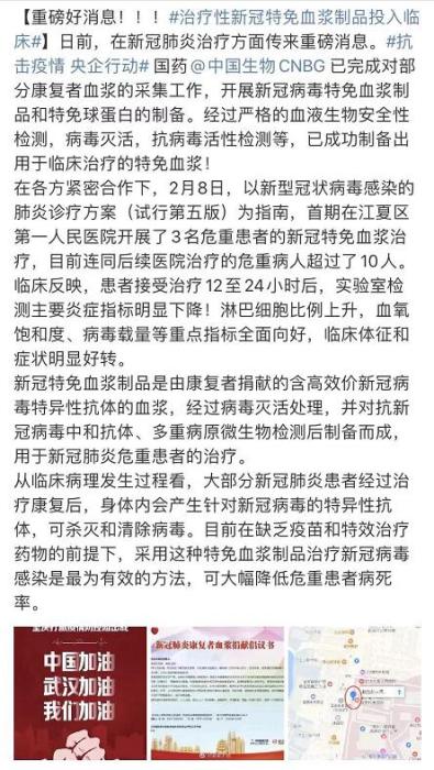 国药中国生物公司表示,其承担的“2019-nCoV感染恢复期患者特异血浆和特异免疫球蛋白制备”项目是科技部组织制定的国家重点研发计划“公共安全风险防控与应急技术装备”重点专项。