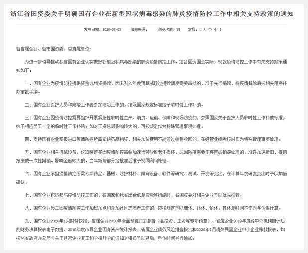 早在2月3日,为进一步引导推动企业切实做好新冠肺炎疫情防控工作,浙江省国资委印发《关于明确国有企业在新型冠状病毒感染的肺炎疫情防控工作中相关支持政策的通知》,在经营业绩考核、捐赠审批、工资总额、研发支出等方面明确了九条措施,对所监管企业积极参与疫情防控予以大力支持。