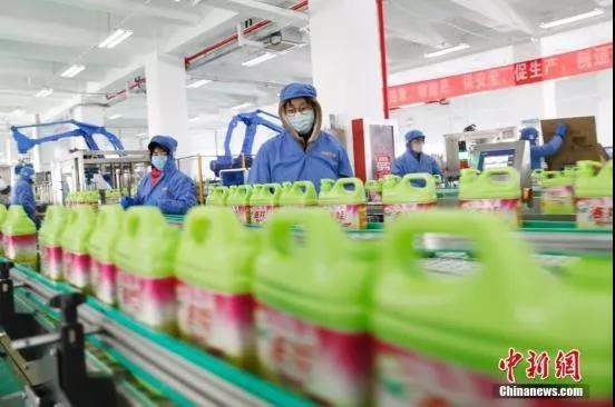 资料图:洛娃集团加快消毒产品生产,生产线24小时工作,职工三班倒换,人停机器不停。中新社记者 韩海丹 摄
