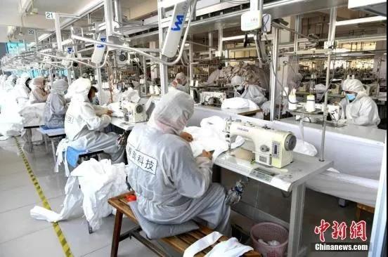 资料图:提前复工的工人正在赶制防护服。中新社记者 王东明 摄