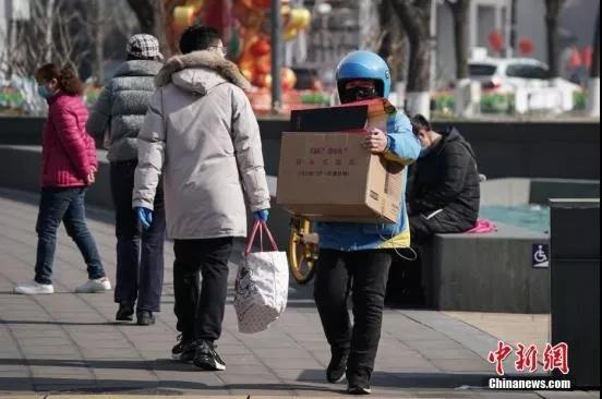 资料图:北京复工首日,一名外送员怀抱纸箱走出金融街购物中心。中新社记者 崔楠 摄