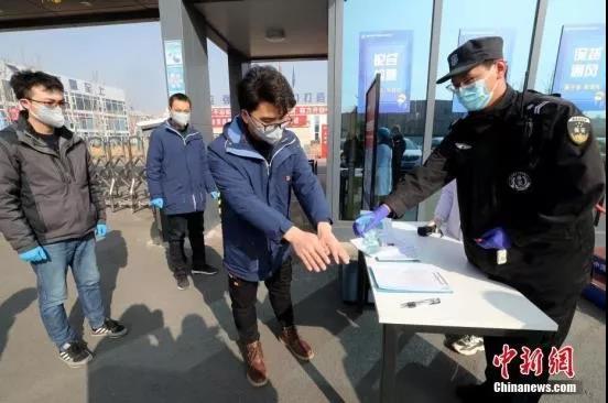 资料图:2月10日,北京铁路枢纽丰台站工程复工,图为工作人员进入办公区前消毒。中新社记者 张宇 摄