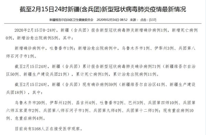 截至2月15日24时,新疆(含兵团)累计报告新型冠状病毒肺炎确诊病例71例(新疆维吾尔自治区50例、新疆生产建设兵团21例),累计死亡病例1例,累计治愈出院病例11例。