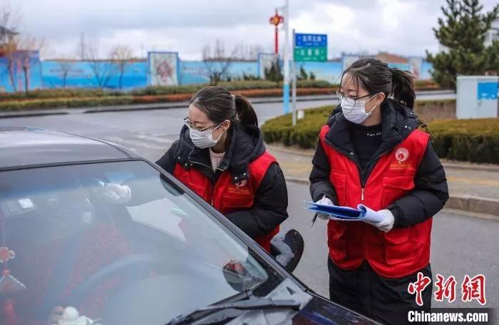 工作人员对居民小区出入口进行设卡体温检测、登记。 李信君 摄