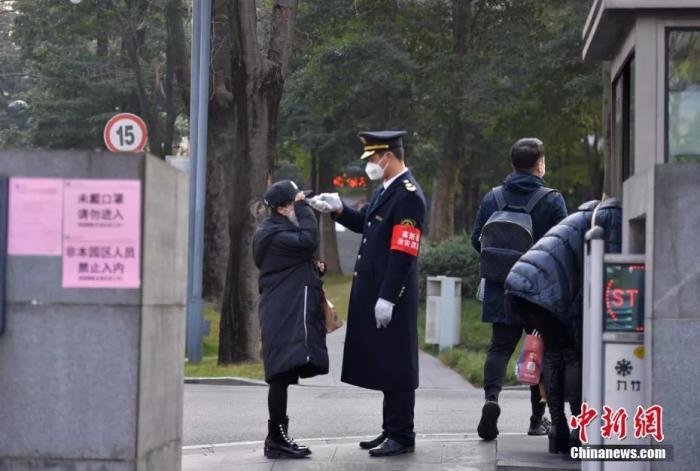 资料图:安保人员给上班族测体温和登记。中新社记者 刘忠俊 摄