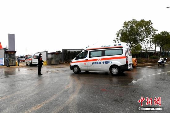 2月10日,武汉市红十字会医院的新冠肺炎患者转运至火神山医院治疗。图为转运患者的救护车队抵达火神山医院。 安源 摄