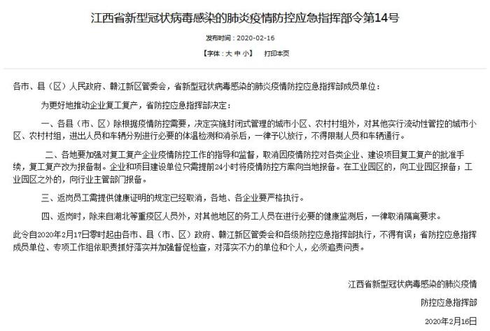 据了解,为更好地推动企业复工复产,江西省防控应急指挥部作出如下决定: