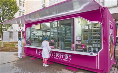 2月14日,碧桂园煲仔饭机器人取餐窗口前,医务人员正在取餐。2月13日,碧桂园集团宣布通过国强公益基金会向武汉捐赠一批全自主研发的集装箱煲仔饭机器人,将在隔离点为医护人员和隔离人员免费提供煲仔饭配餐服务。2月14日下午,首批煲仔饭机器人已运抵湖北省国资学院隔离点。车队出发时,有关方面紧急调拨了可做7000份煲仔饭的食材同车运往武汉。