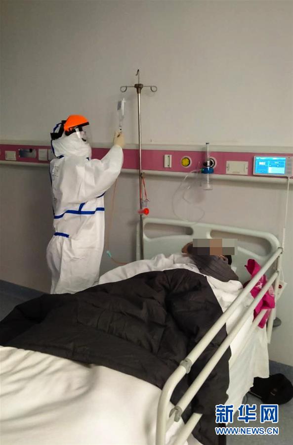 2月15日,广东省对口支援湖北荆州医疗队队员、南方医科大学南方医院的许雪在荆州洪湖人民医院照顾患者。新华社发
