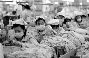 2月14日,山东青岛一生产车间,复工后,工人在制作出口到海外的服装产品。新华社发