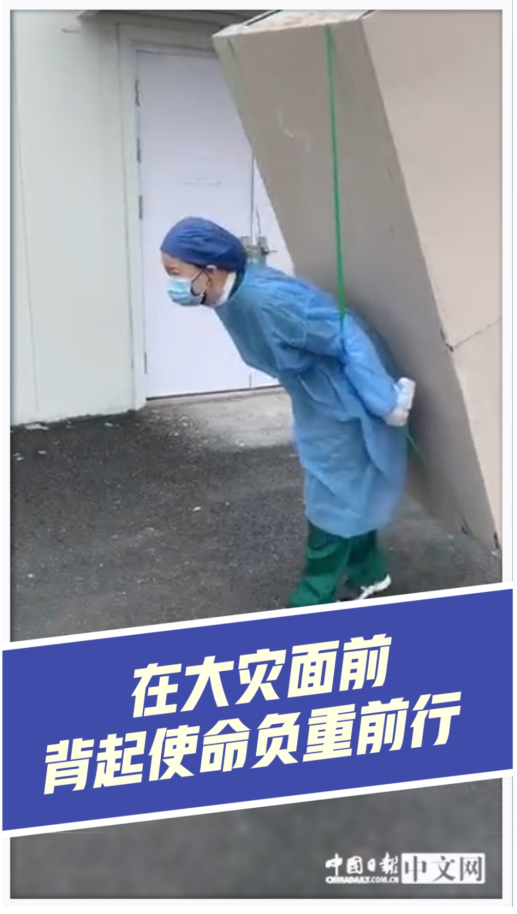 画面中扛着铁皮柜的姑娘是湖北省肿瘤医院支援雷神山医院的医疗队员朱亚。2月10日,在搬运物资的过程中,考虑到其他同事前一天凌晨收治病人已经整整26个小时没休息,朱亚二话不说背上40多斤的柜子,迈着沉重的步子开始往外走。这个瞬间被正准备打电话求助的搭档拍下,网友称赞她“中国最美的搬运工”,“大灾面前,背起使命负重前行”。