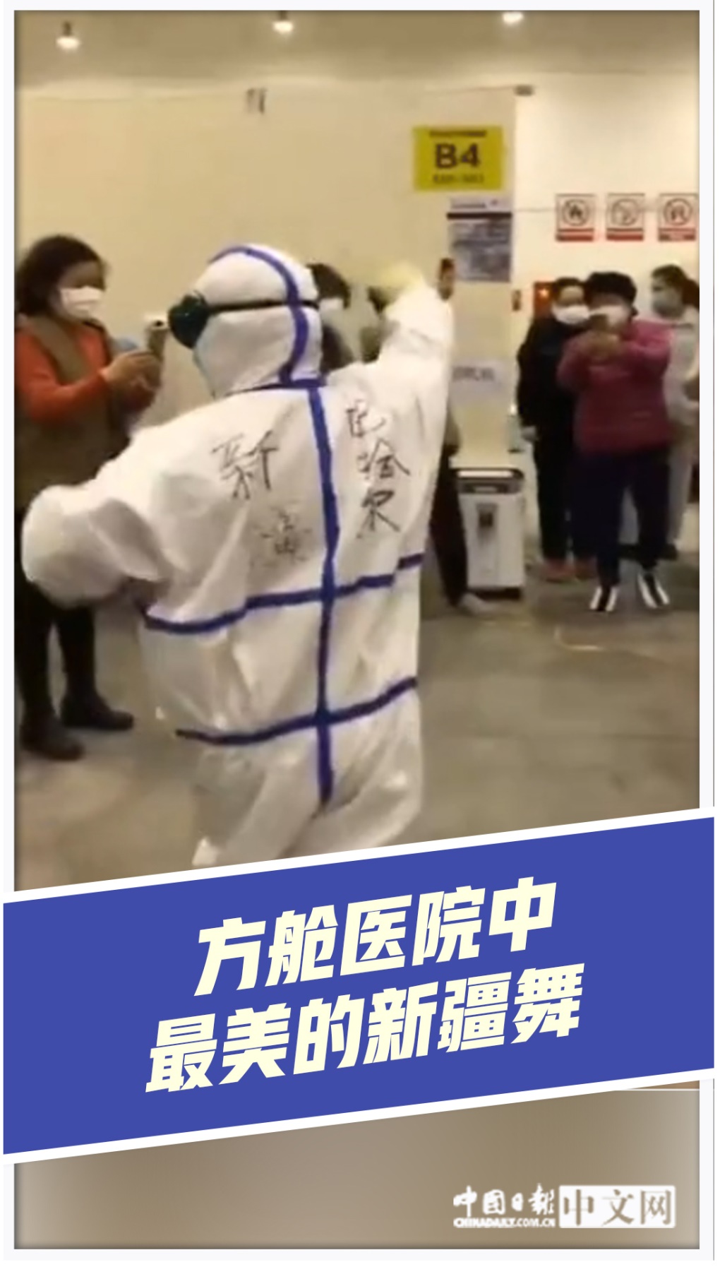 近日,在武汉的方舱医院,来自新疆第二批支援湖北医疗队医务工作者巴哈古丽穿着笨拙的防护服带领患者跳“麦西来甫”“黑走马”。