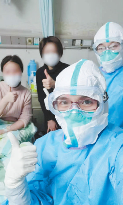 在湖北省中西医结合医院病区,第二支国家中医医疗队队员、北京中医药大学东方医院医生王晓嘉、王晓君与出院患者合影。