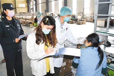 2月20日,位于中缅边境云南省瑞丽市的德宏边境管理支队姐勒边境派出所成立了缅籍人员务工“胞波”防疫队,守牢复工返工人员的“第一道关口”。同时开通企业办事绿色通道,助力100多家中小微企业安全复工复产。图为防疫队队员深入企业开展疫情防控工作。