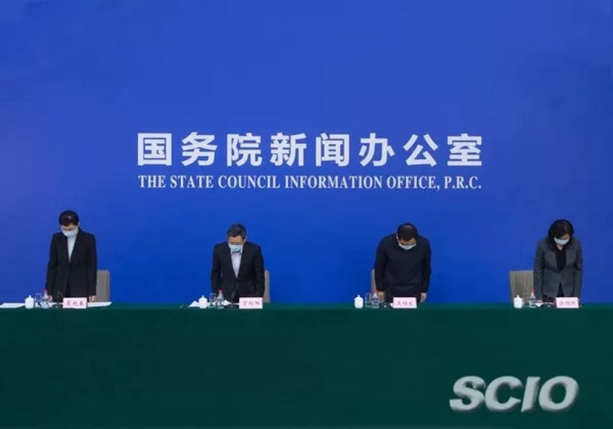 4、发布会上,中央指导组成员、国务院副秘书长丁向阳,中央指导组成员、国家发展改革委员会副主任连维良,中央指导组成员、中医药局党组书记、副局长余艳红等,起身为在疫情中牺牲的医护人员和不幸去世的患者默哀。