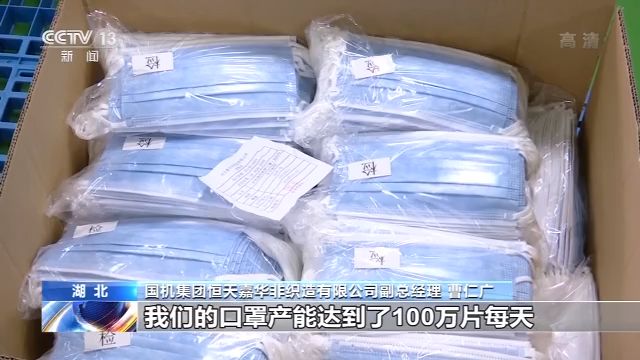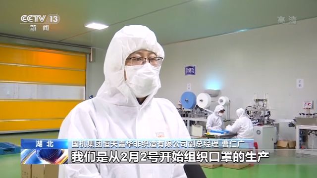 国机集团恒天嘉华非织造有限公司副总经理曹仁广:我们是从2月2日开始组织口罩的生产,那我们就紧急协调我们的生产线,还有厂房以及设备,我们的口罩产能达到了100万片每天。
