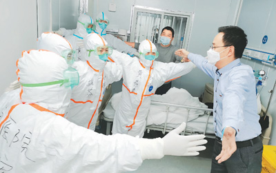 2月18日,武汉雷神山医院首批两名新冠肺炎确诊患者出院,他们将回到社区接受14天医学观察,并由医护人员进行密切观察和追踪。图为当日出院的36岁新冠肺炎患者王先生(右一),在出院前与医护人员隔空“拥抱”。