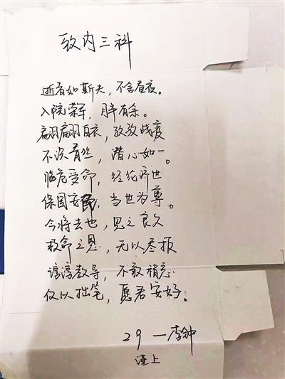 治愈出院的李先生,出院前在药盒上给湖北省荣军医院内三科医护人员写了一首小诗以表感谢。
