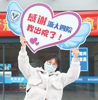 在浙江义乌,一名确诊患者治愈出院,走出浙江大学医学院附属第四医院时举着牌子对医护人员表示感谢。