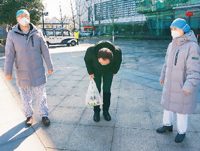 在湖北武汉,新冠肺炎患者郑先生在武汉华中科大同济医院中法新城院区治愈出院。郑先生深鞠一躬,感谢所有帮助过他的医护人员。