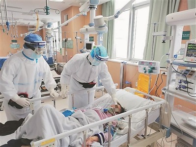 江苏省人民医院呼吸与危重症医学科副主任、主任医师,武汉市第一医院国家医疗队联合专家组组长齐栩(右一)和同事在武汉市第一医院重症监护病区给危重症患者进行检查。