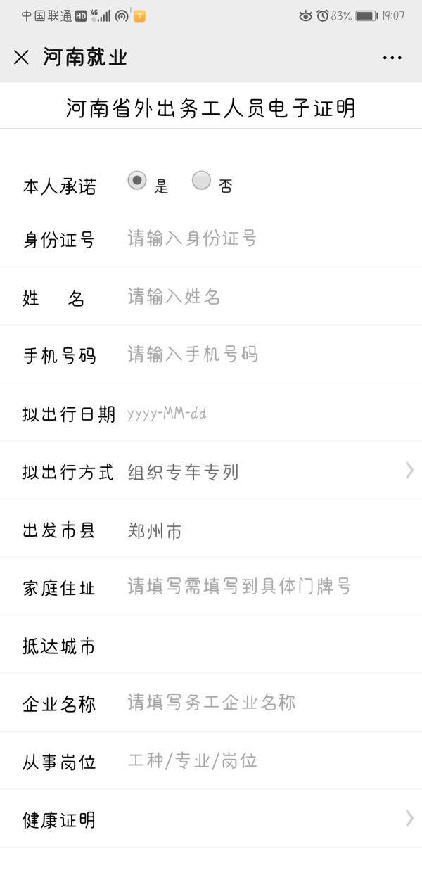 扫描二维码后,进入“河南省外出务工人员电子证明”界面,需要填写身份证号、姓名、手机号等个人基本信息,还需要填写出行日期、拟出发方式、出发地点和抵达地点等出行信息,以及本人的企业名称、岗位、有无健康证等工作信息,填写完毕后点击“提交”就完成登记。完成界面弹出,提醒填写人保持电话畅通,以便随时联系。