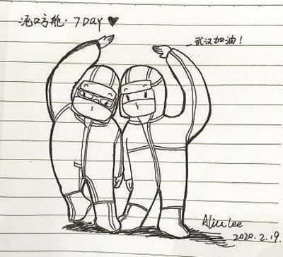 每一天,我都把漫画版“方舱日记”发到网上。这些给我温暖的守护者就是我心中的英雄。有一位来自安徽的护士,她叫胡慧文。看着她带着病友跳舞,那姿势像在飞翔,太可爱了。今天早晨,两位护士推着小车发放饭菜。好像是轮子不太灵活,也好像是穿着防护服不太方便,他们推得有点艰难。我把他们也画了出来。